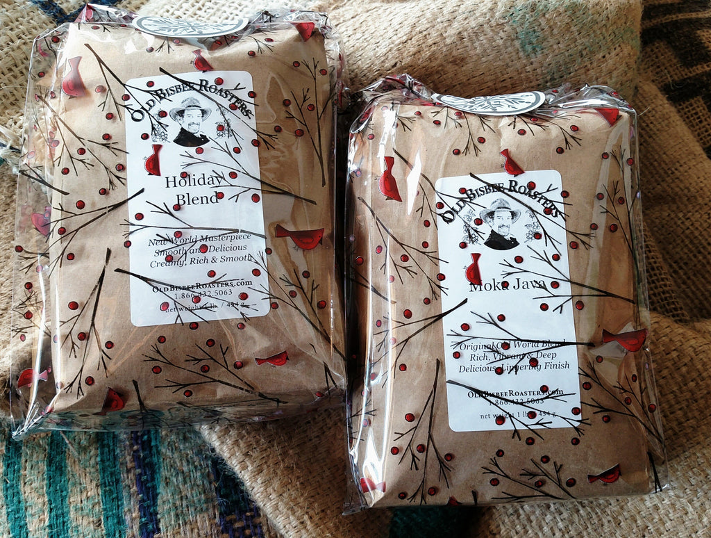 Festively packaged in a holiday-themed cello bag wrapper while supplies last. This item will have our standard Old Bisbee Roasters front labels to ship out freshly roasted coffee as quickly as possible. Thank you so much for being so supportive!